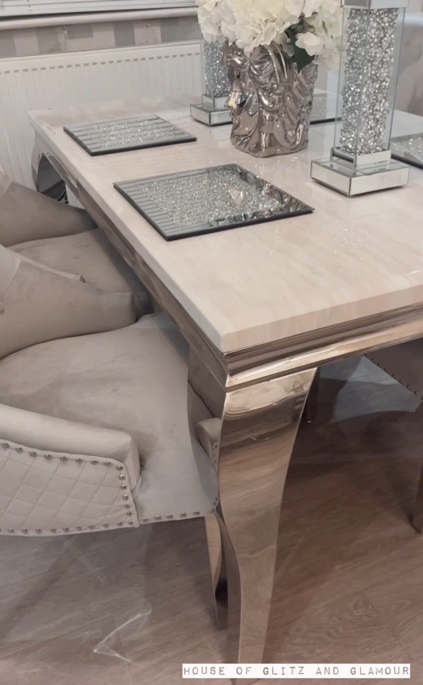 1.5m Louis Cream Dining Table + 4 Light Grey Chelsea Tufted Lion Knocker Back Chairs