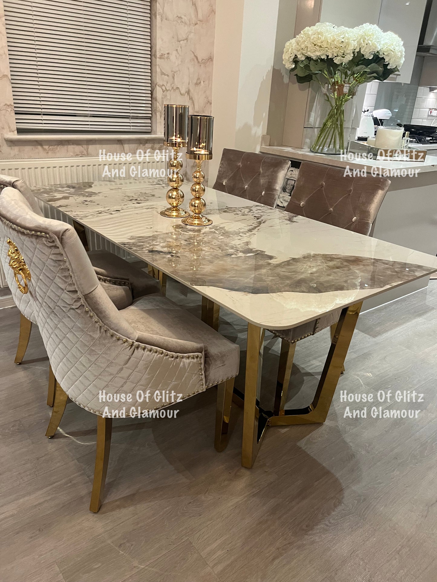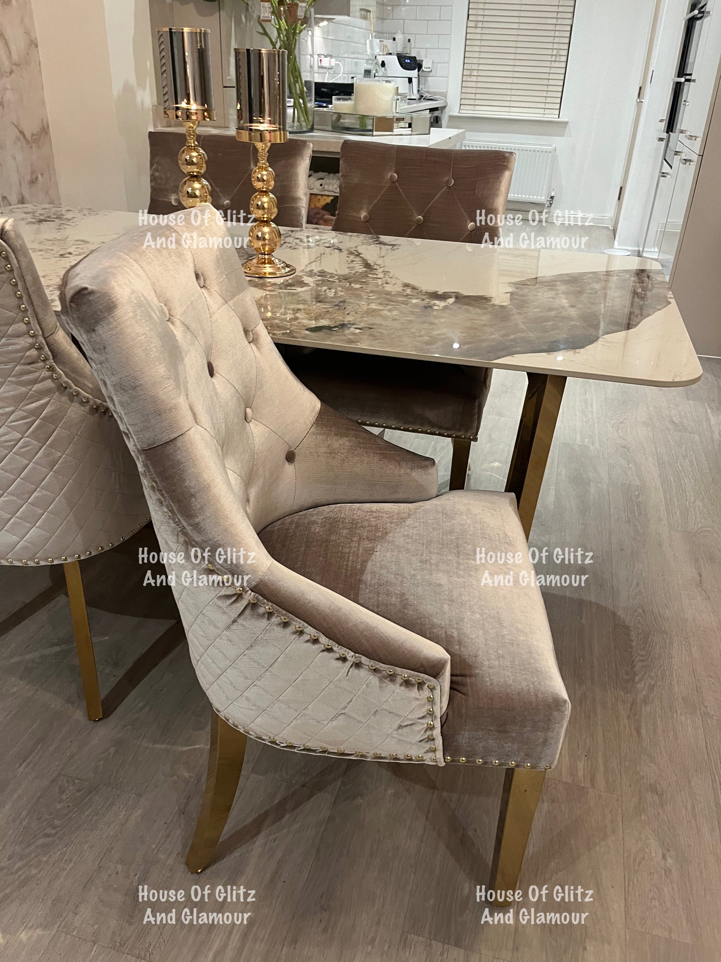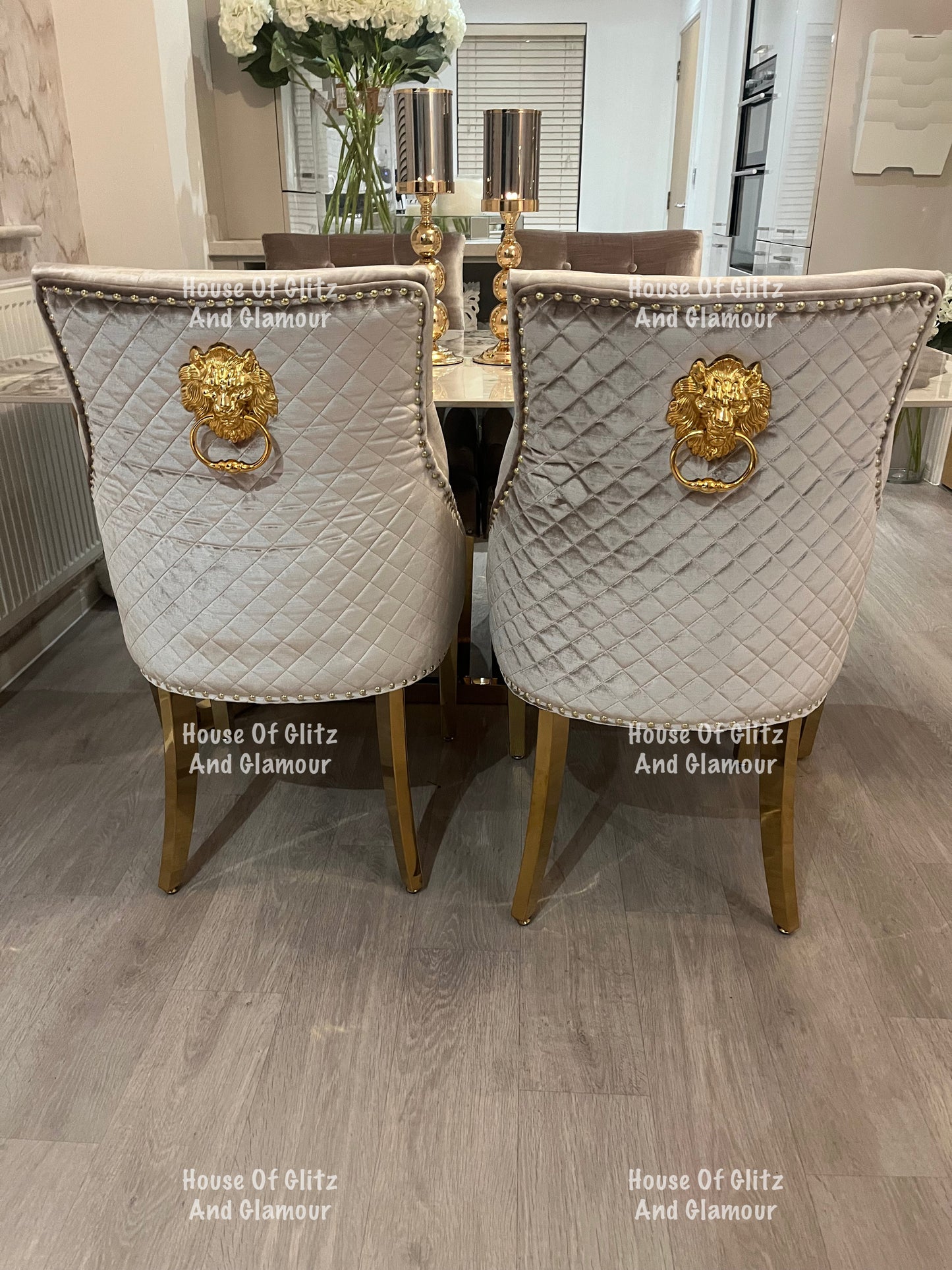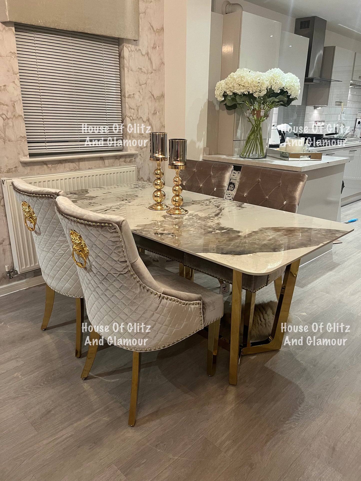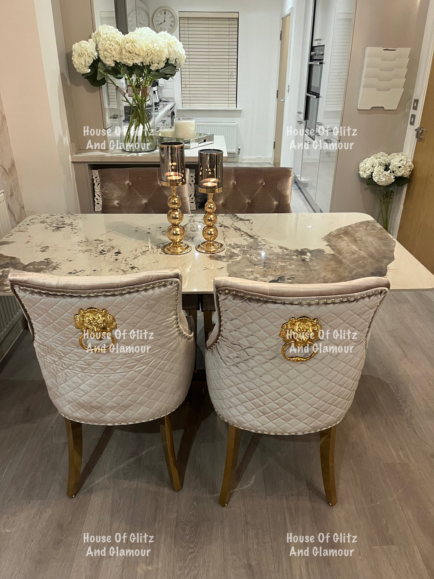 1.8 Dining Table + 4 Chelsea Champagne With Gold Legs Quilted Velvet Lion Head Knocker Back Dining Chairs