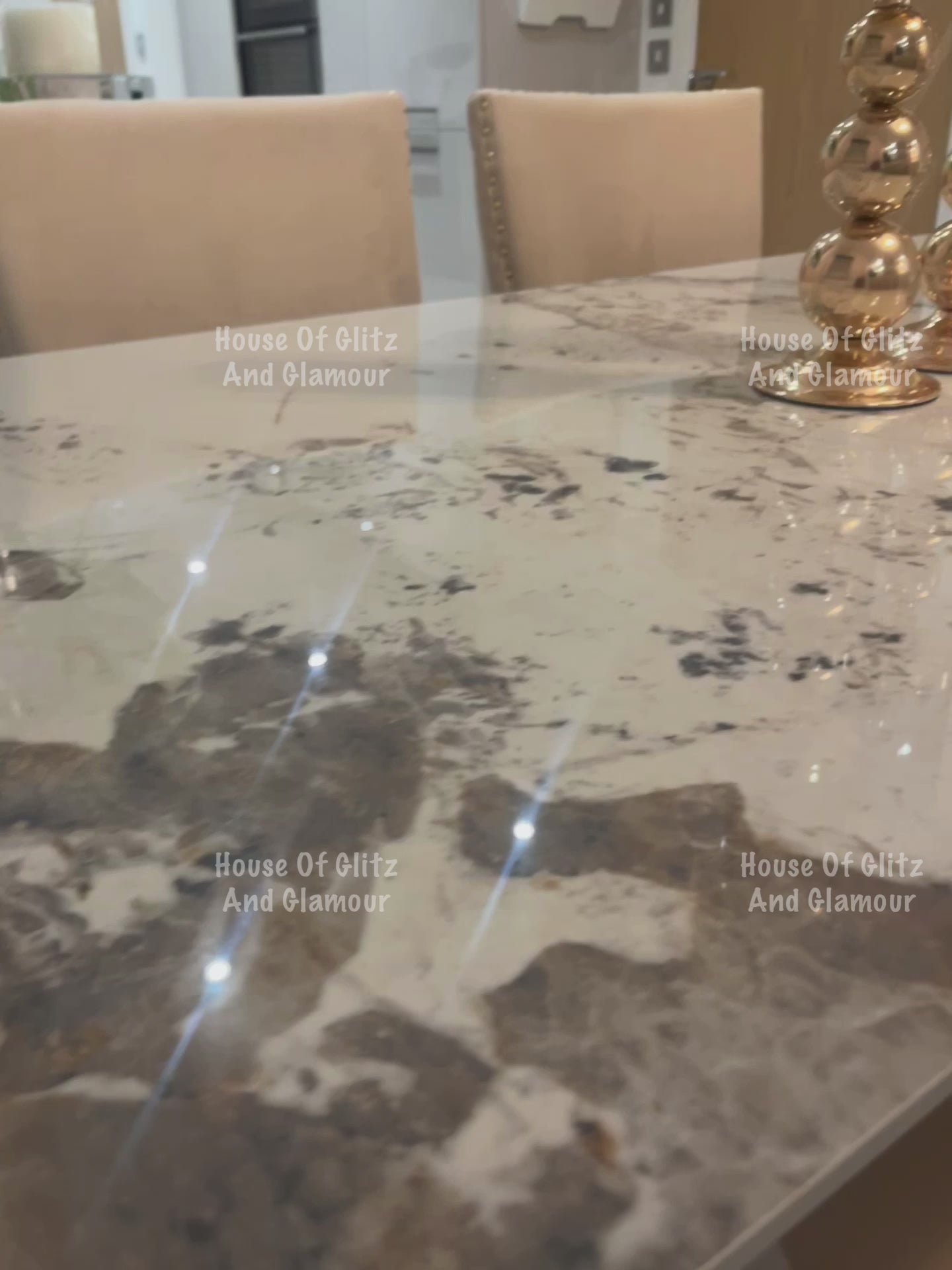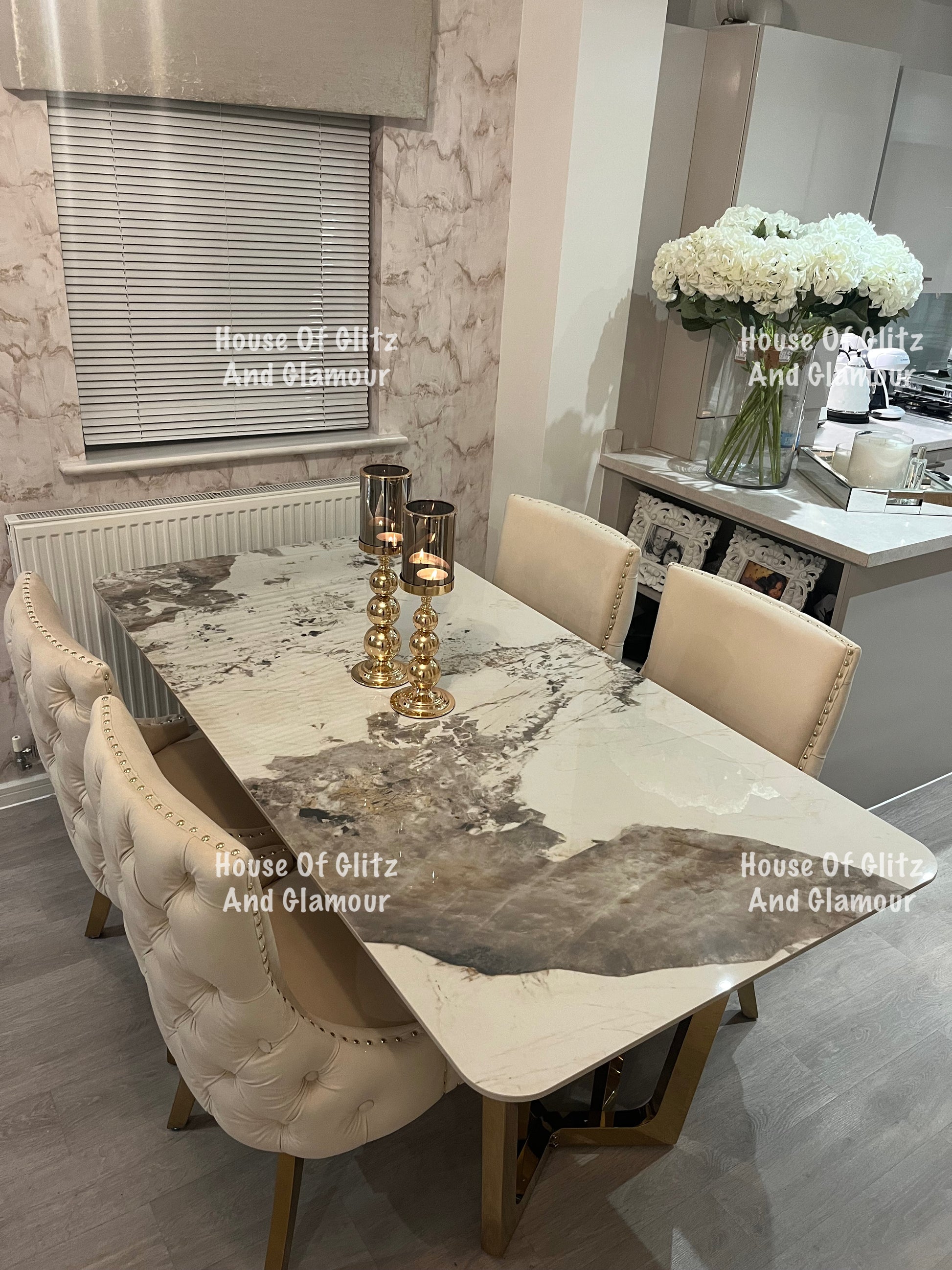 1.8 Pandora Sinted Stone Dining Table + 4 Bentley Cream Velvet Studded Back Gold Leg Dining Chairs.