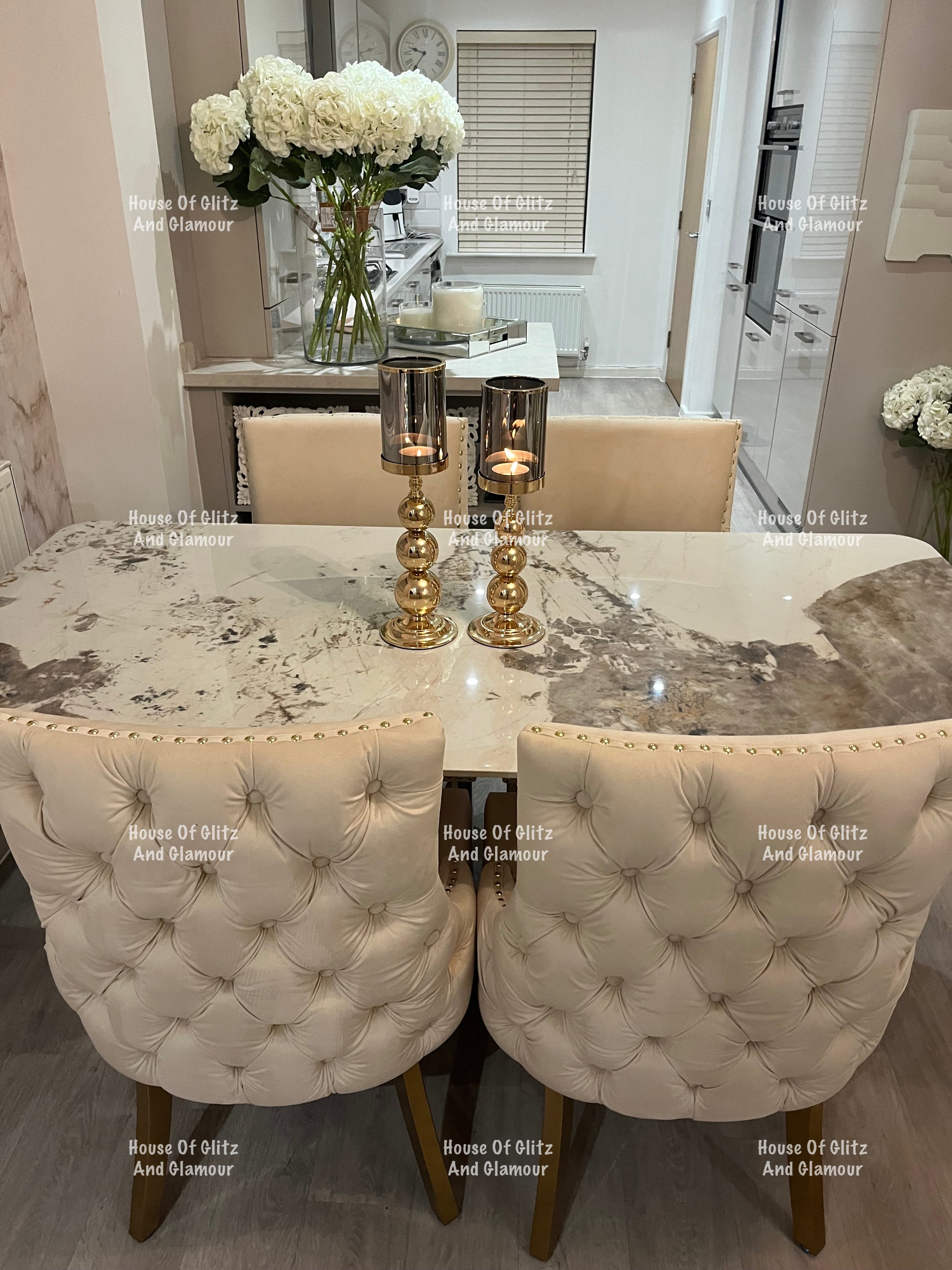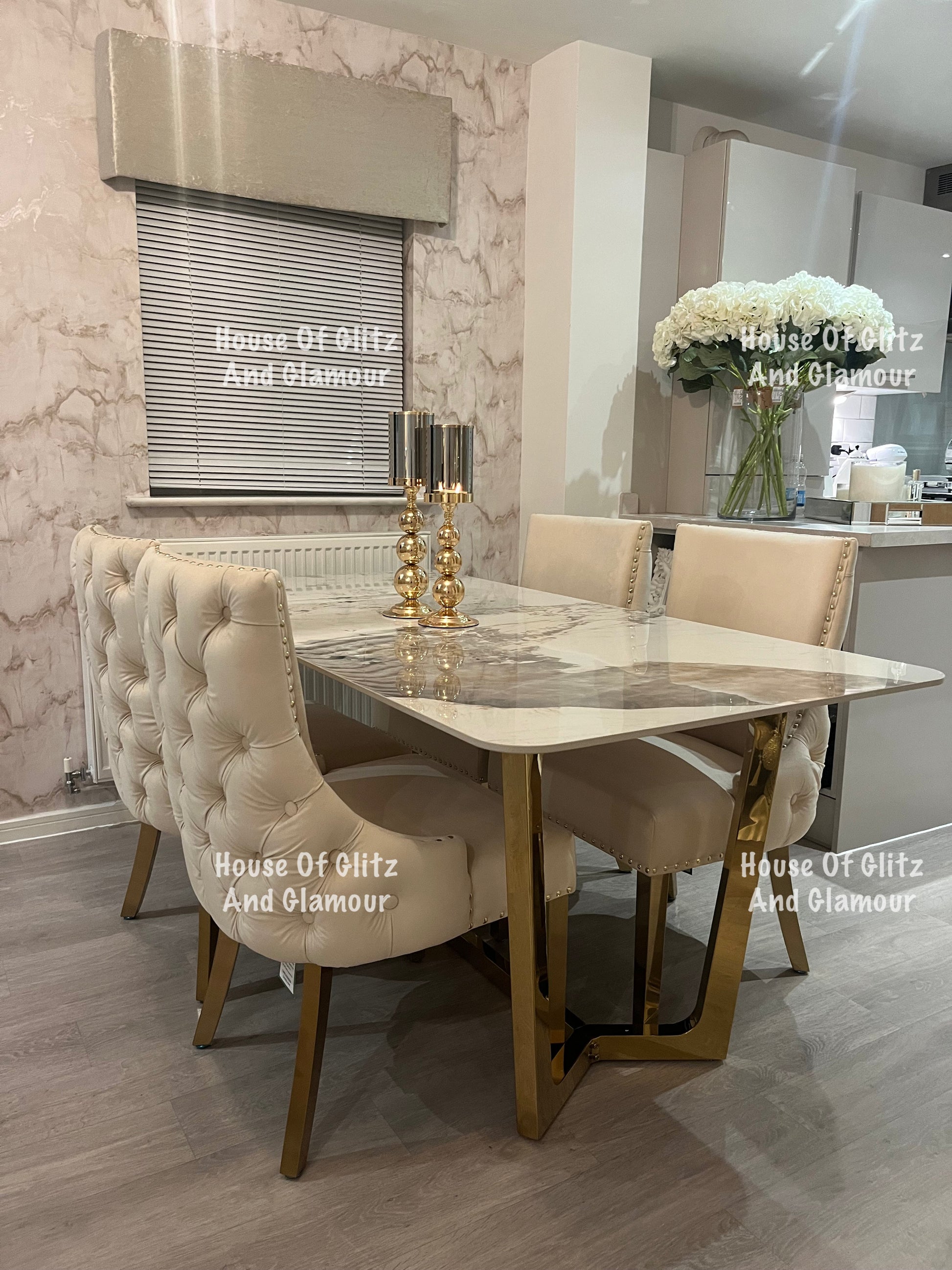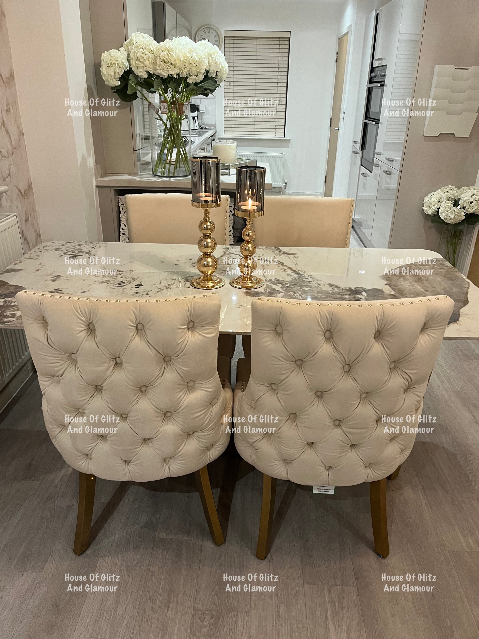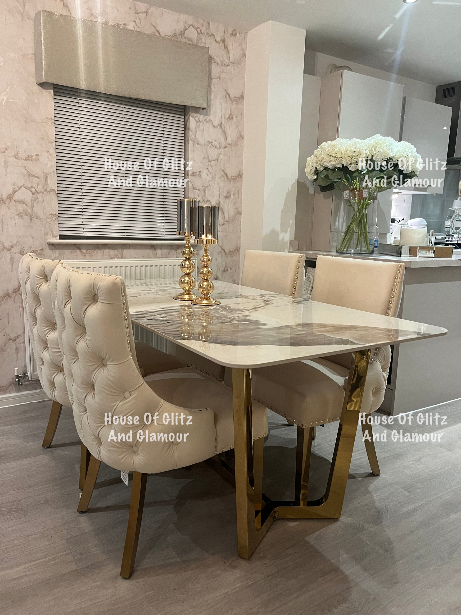 1.8 Pandora Dining Table + 4 Bentley Cream Velvet Studded Back Gold Leg Dining Chairs