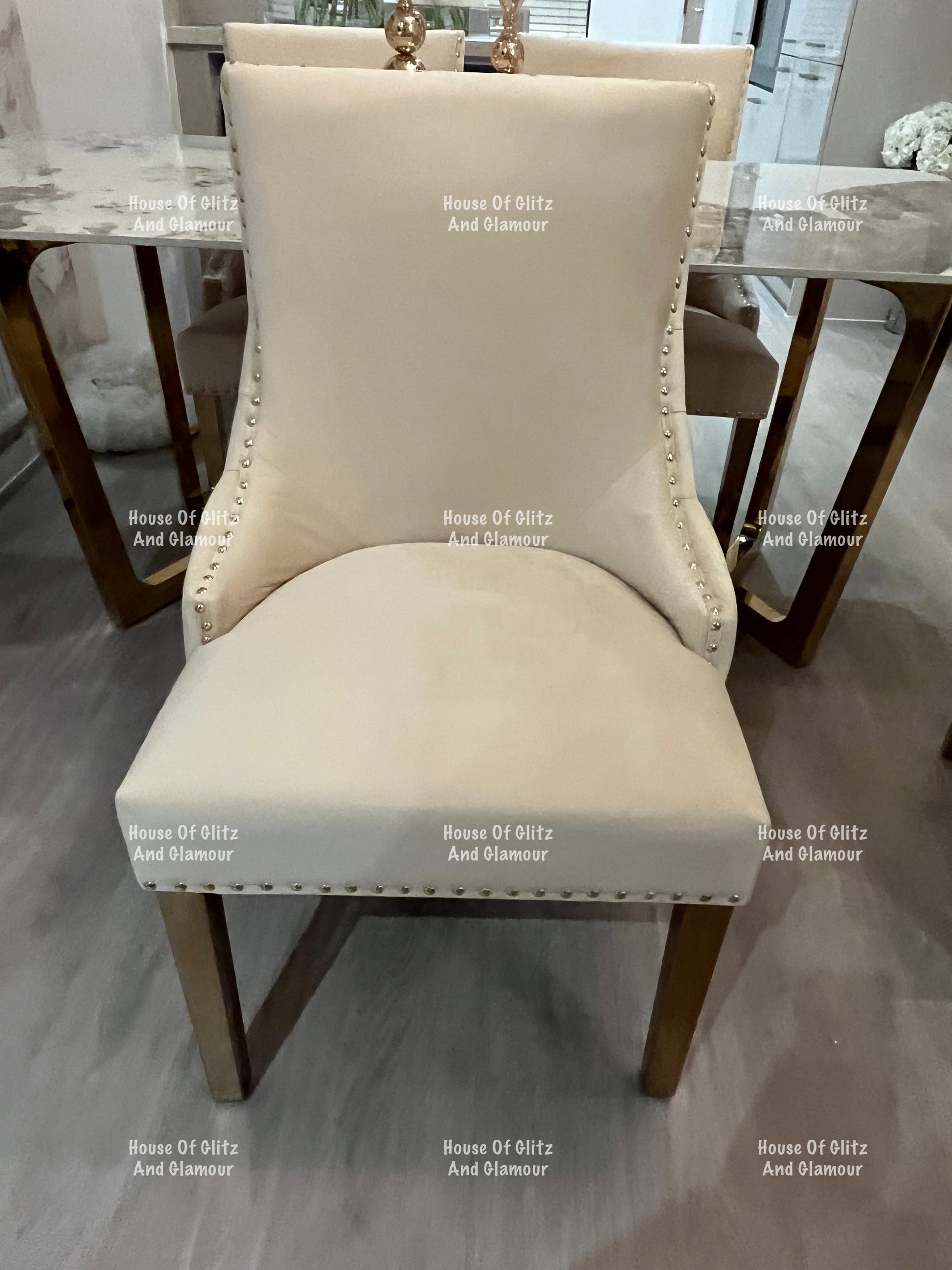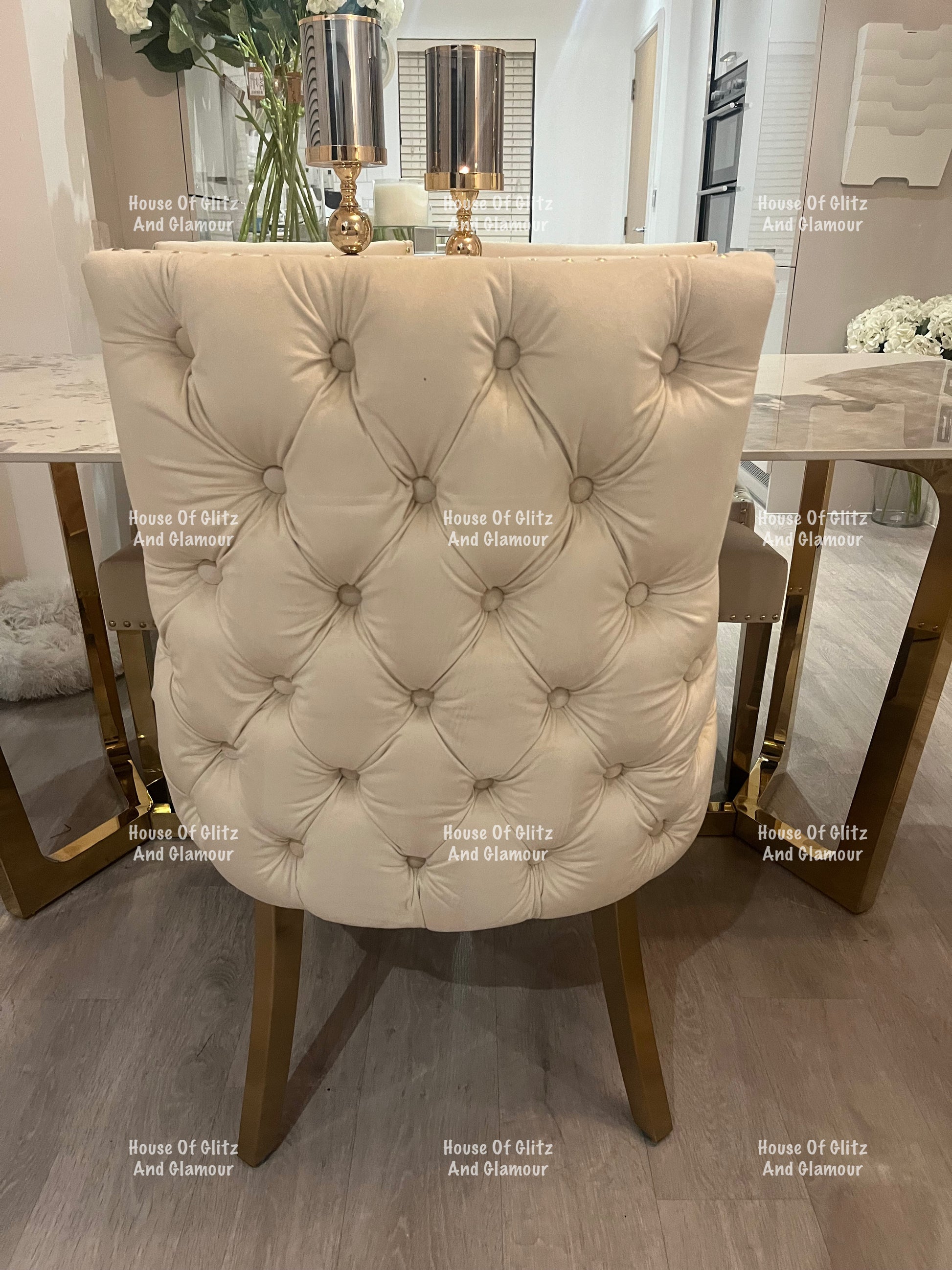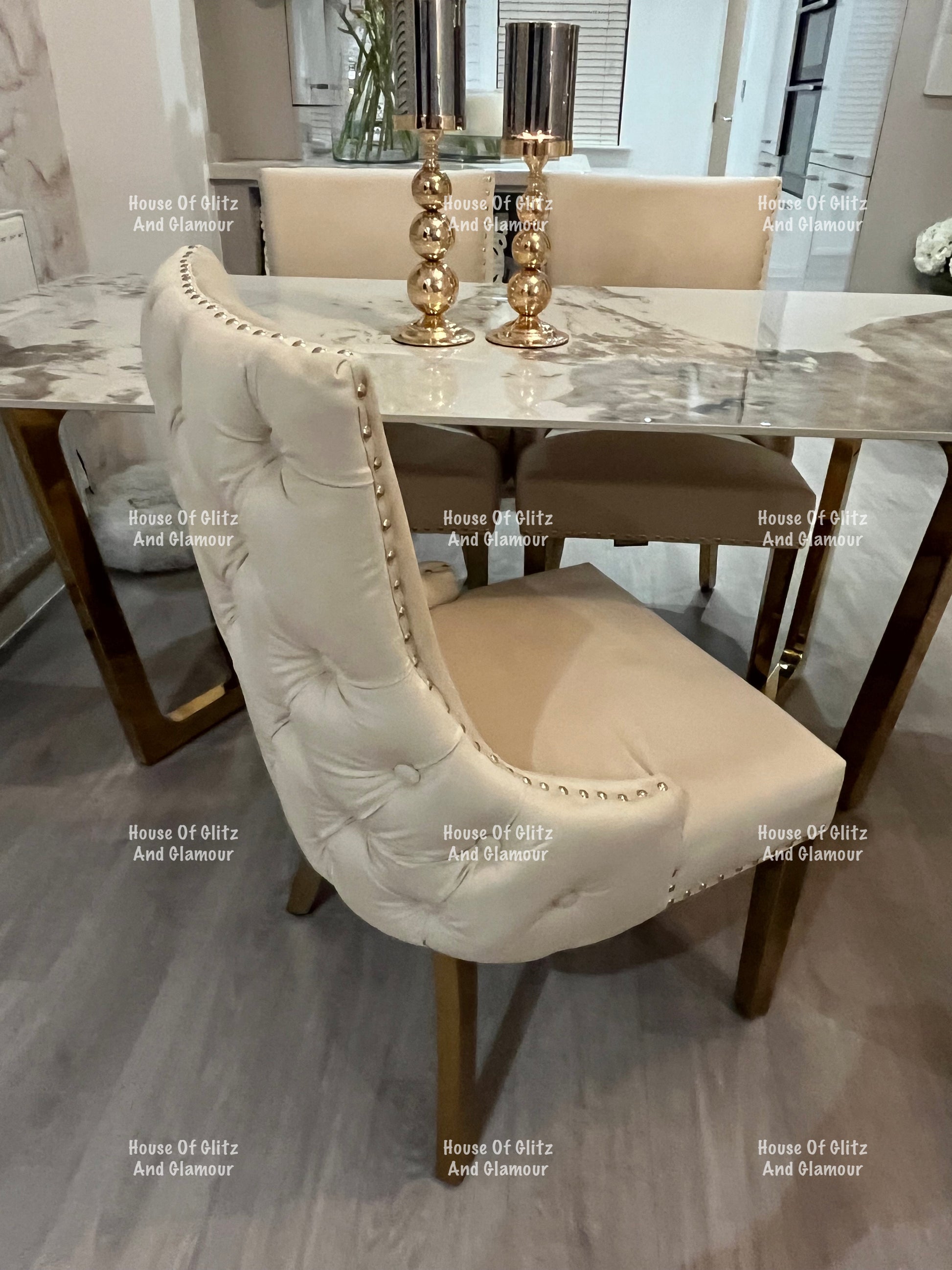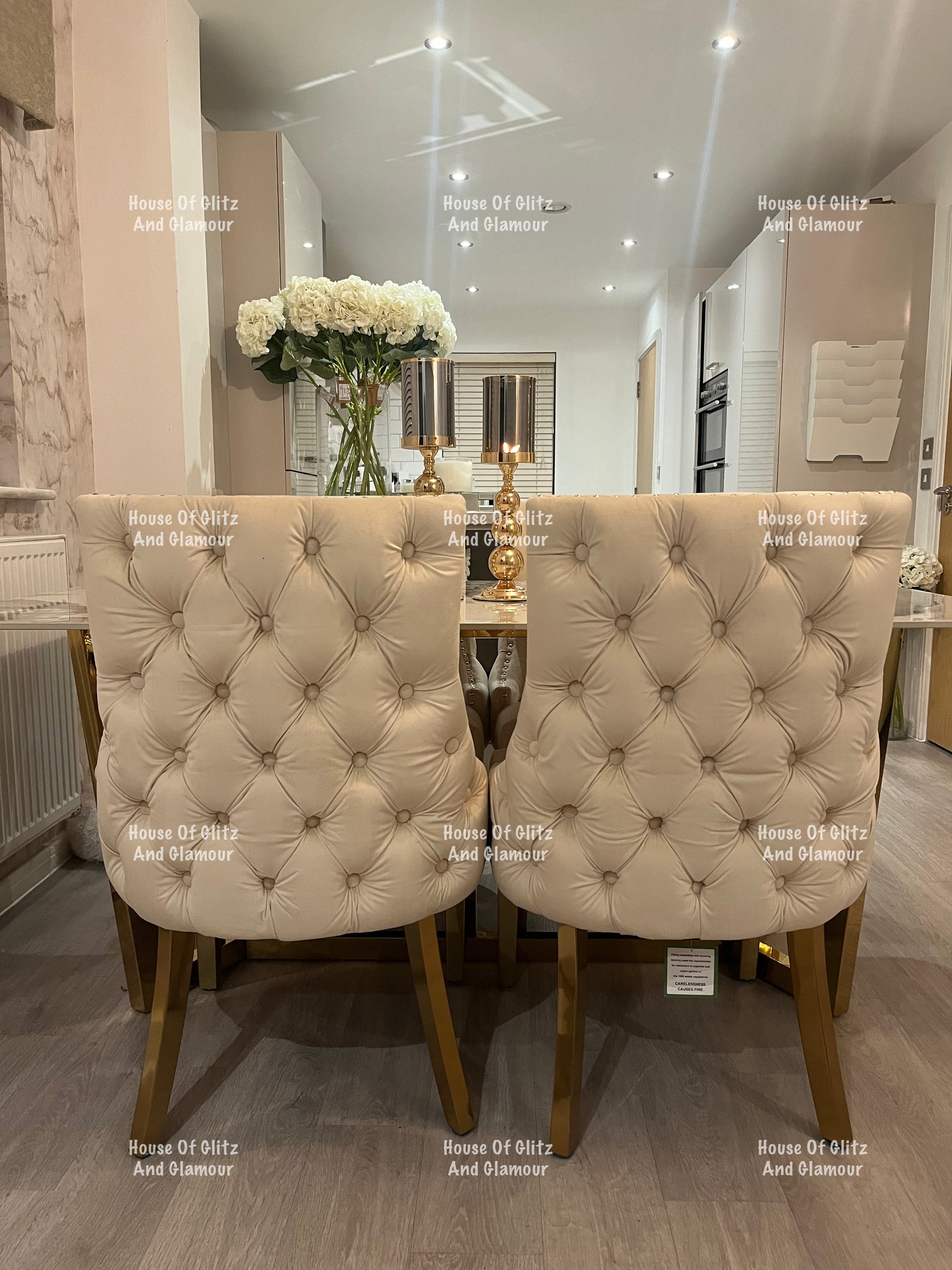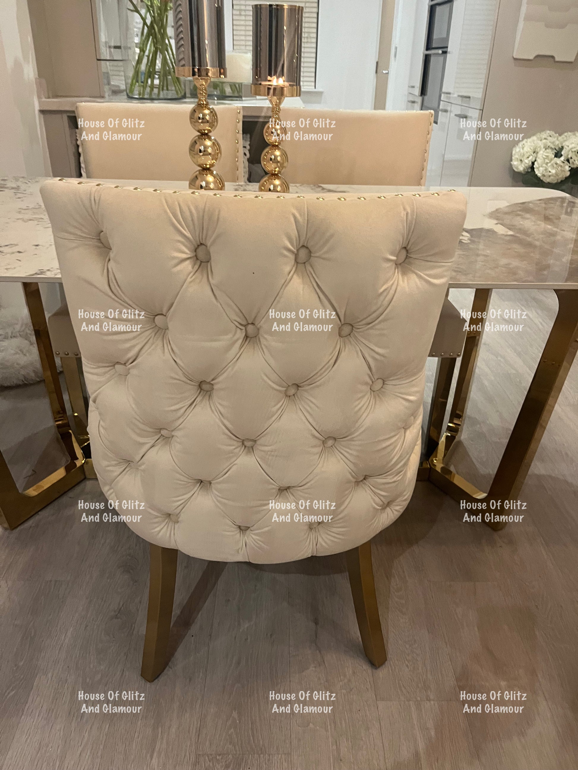 1.8 Pandora Dining Table + 4 Bentley Cream Velvet Studded Back Gold Leg Dining Chairs