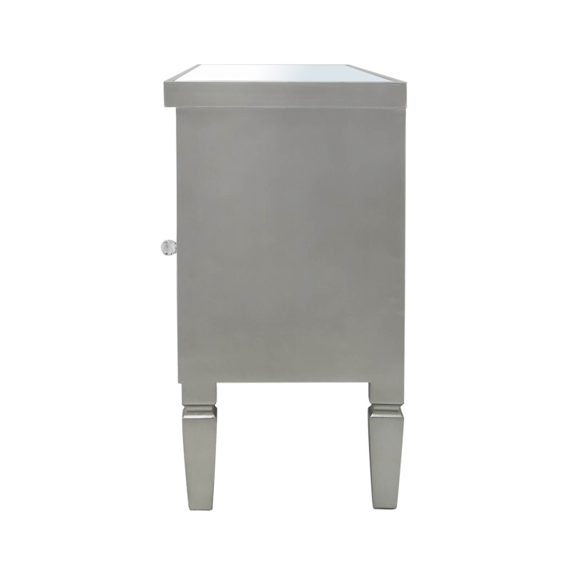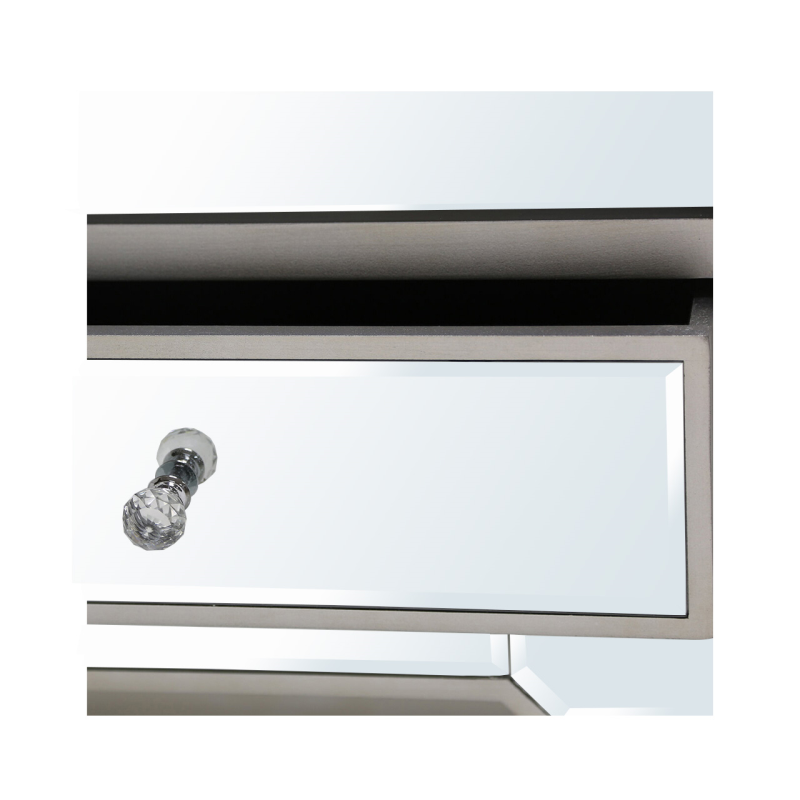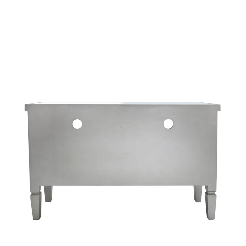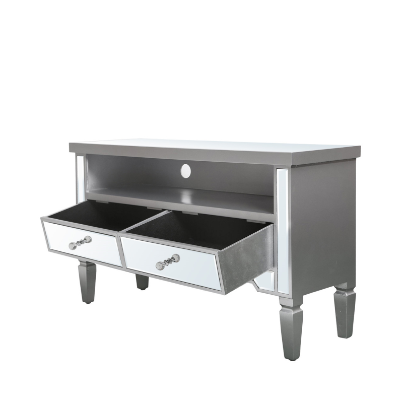 Add class to any living room with this Vista mirror TV entertainment unit with champagne wooden trim. The unit features a mirrored top and tapered wooden legs and two spacious drawers with crystal handles and is a perfect combination of elegance and functionality.