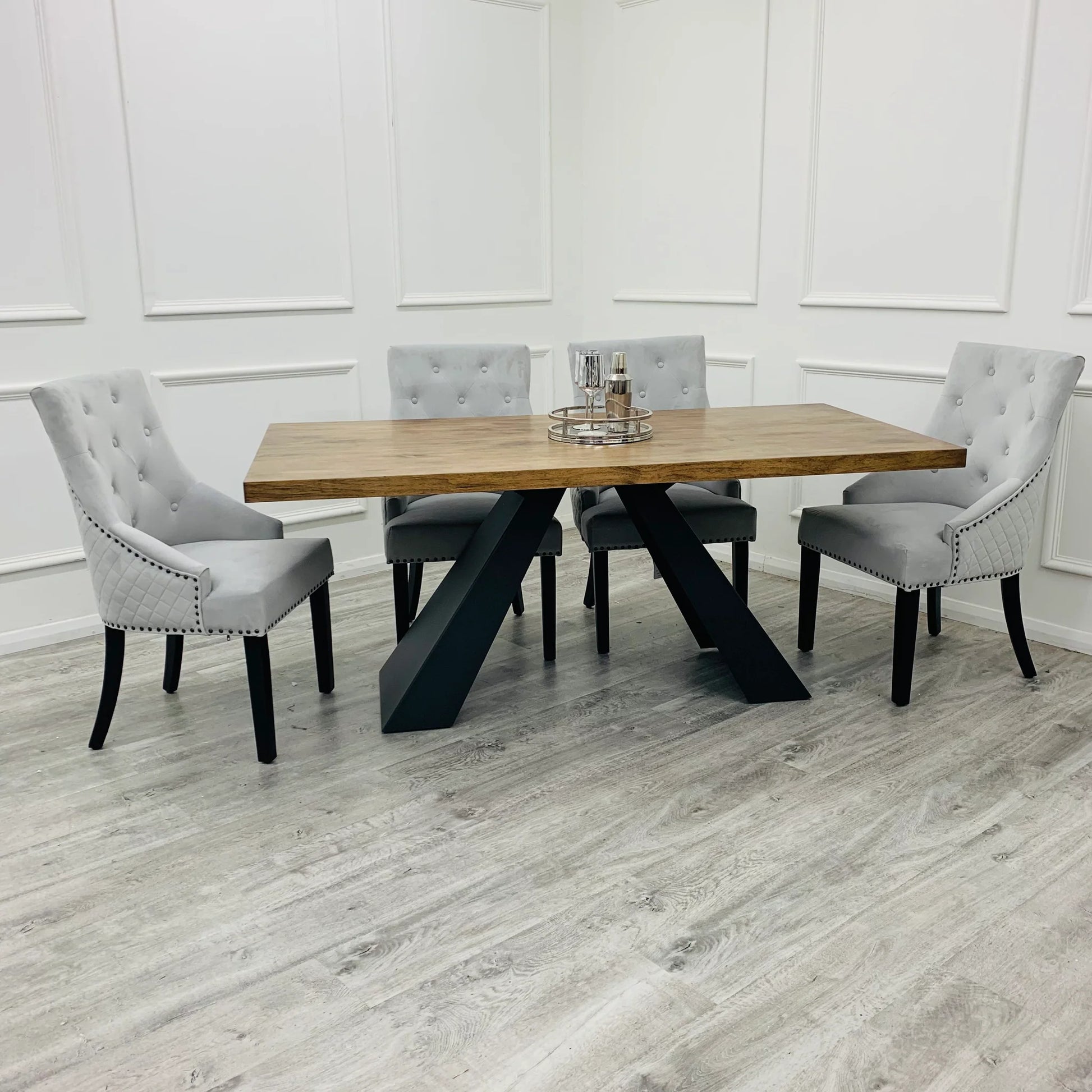 Our popular Chelsea Dining Chair is now available with Black Metal details. We've introduced this new option, which maintains the signature Chelsea quilted back and adds a refreshing twist using black wood for the legs, studs and ring knocker. We have in Light Grey Velvet. Pair with our new black based Sintered stone tops dining tables.