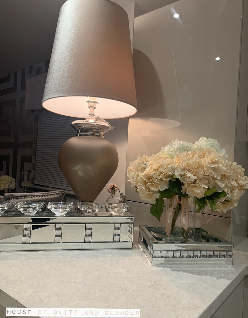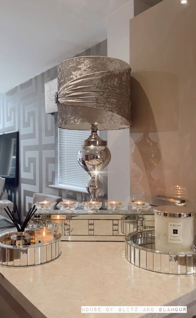 Featuring a silver mirrored glass body with MDF and decorated with acrylic crystals on the middle, this intriguing piece of furniture is a part of the popular 918 design series