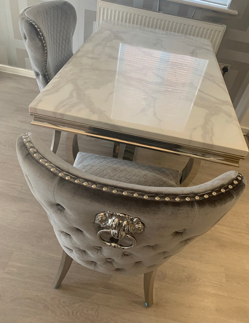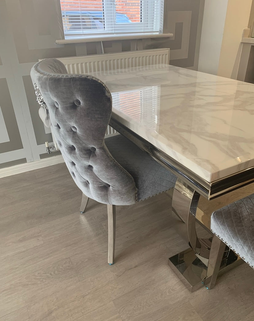 Valentina Grey Crushed Velvet Lion Knocker Winged Back Quilted Dining Chair