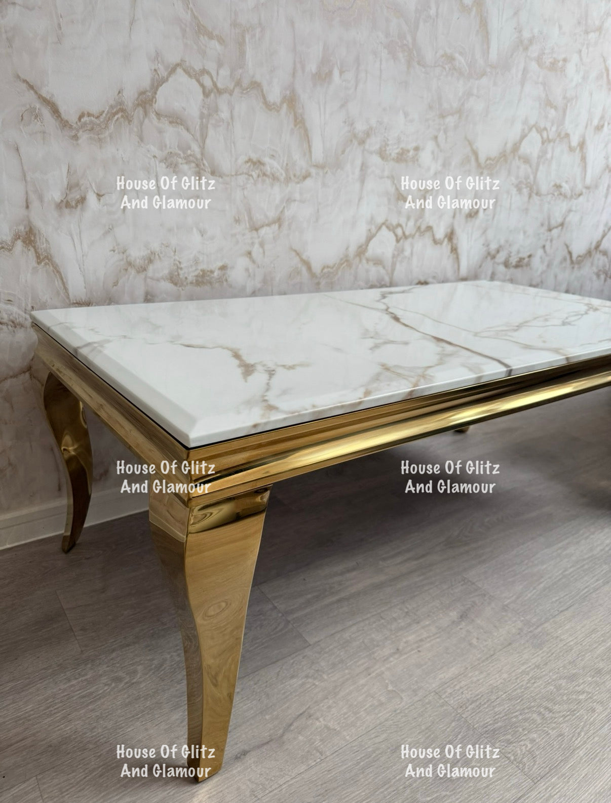Add a touch of glamour to your home with this elegant Louis coffee table, featuring a Calacatta effect white marble top and polished gold stainless steel legs.
