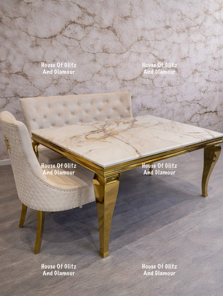 Add a touch of glamour to your dining space with the Louis Calacatta Effect White Marble Dining Table, featuring elegant gold legs and a luxurious marble-effect top.