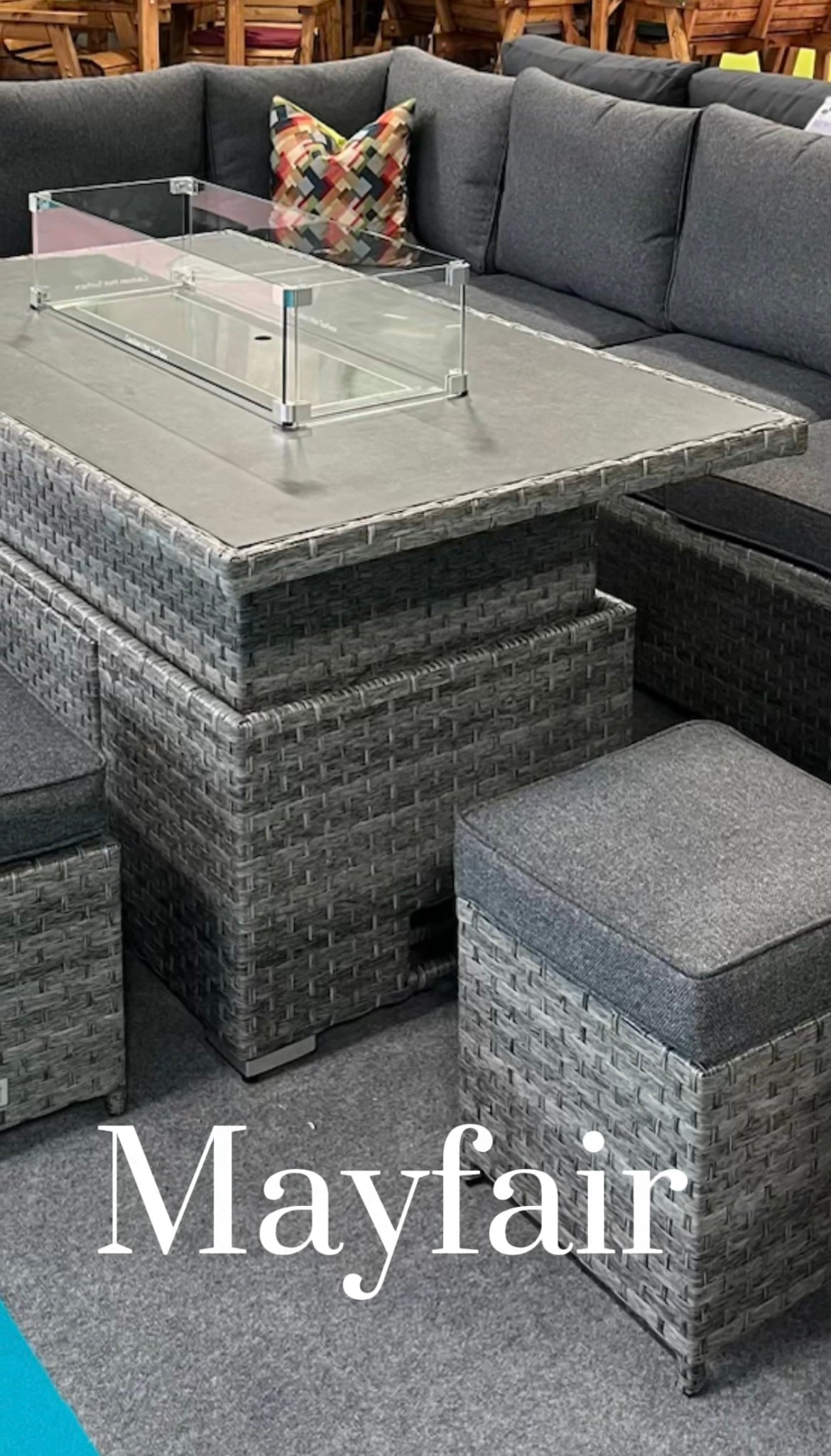 MAYFAIR FIRE PIT Corner Sofa with Rising Table & Fire Pit plus 3 Stools in Grey