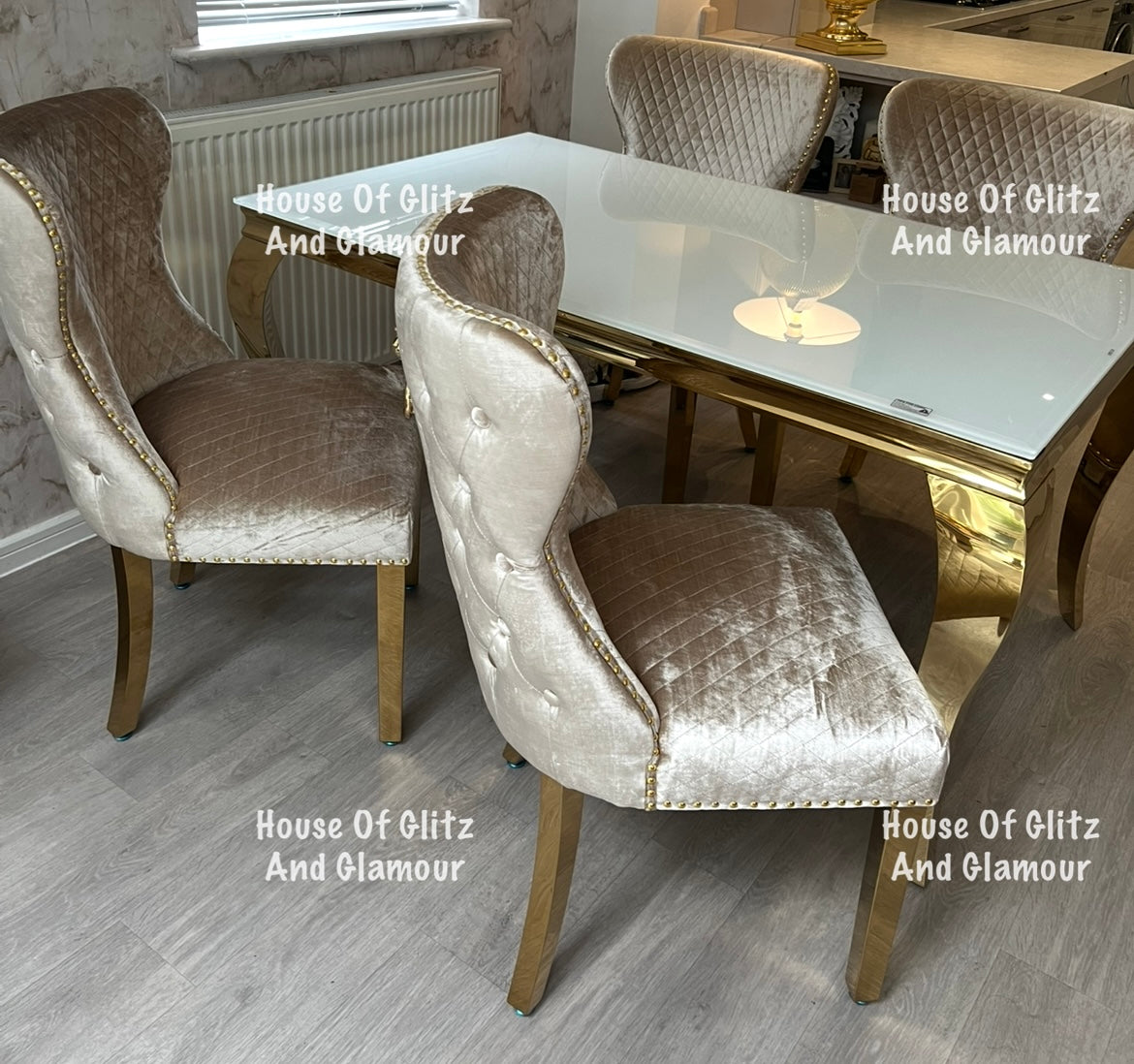 Valentina Mink Champagne Crushed Velvet & Gold Lion Knocker Winged Back Quilted Dining Chair