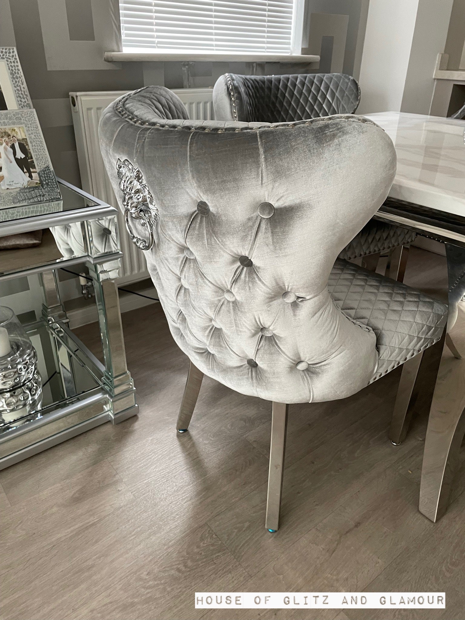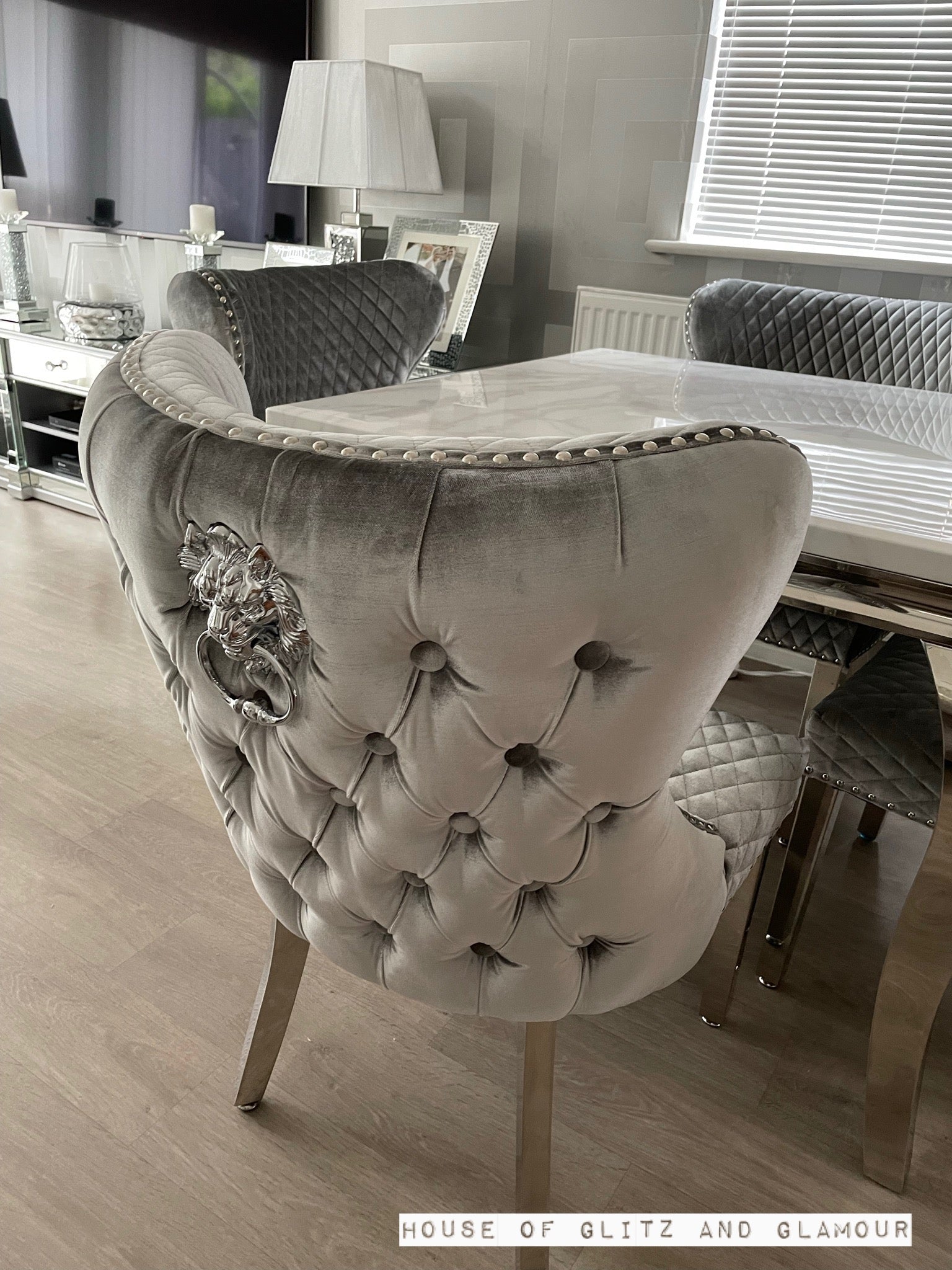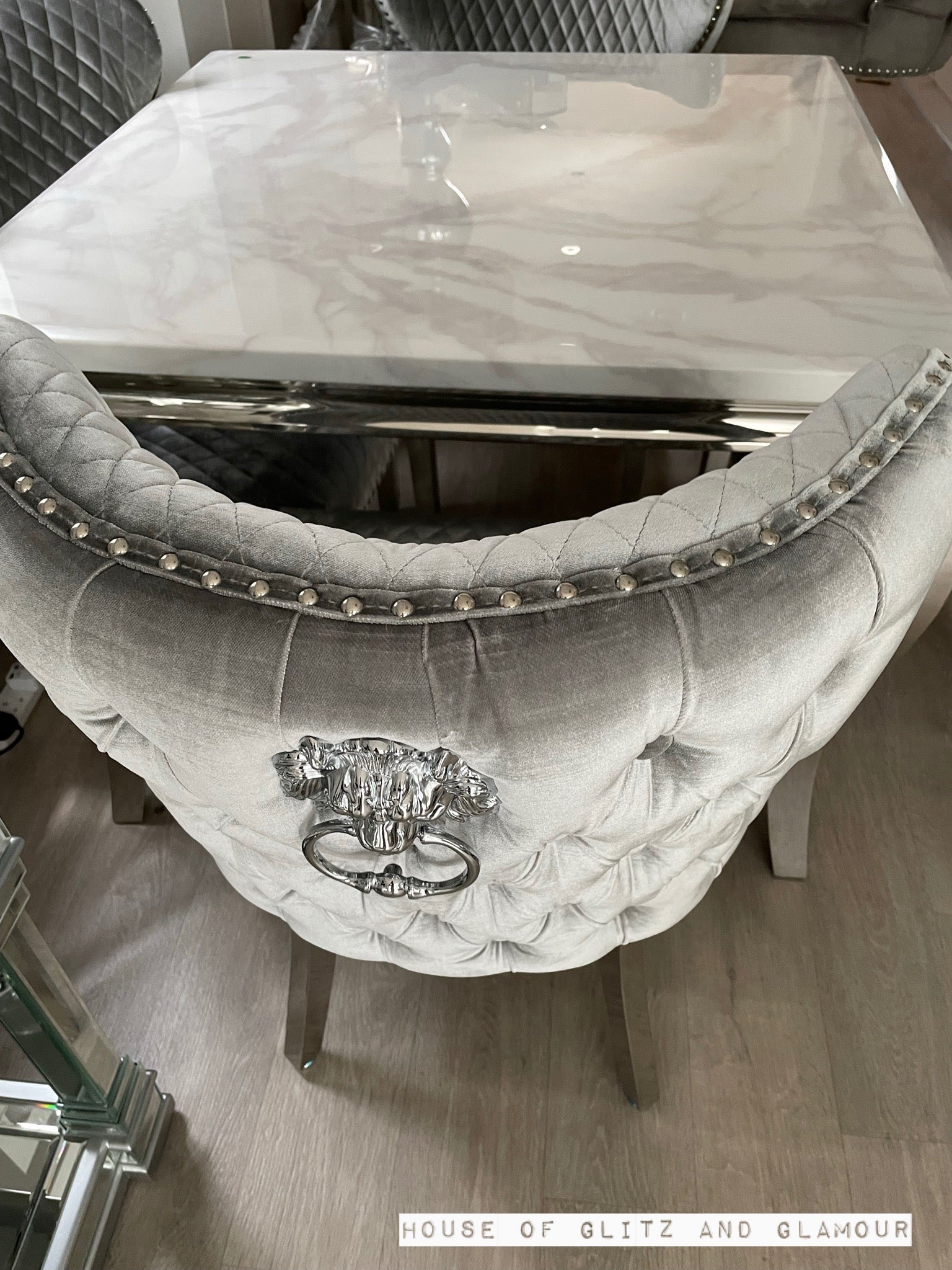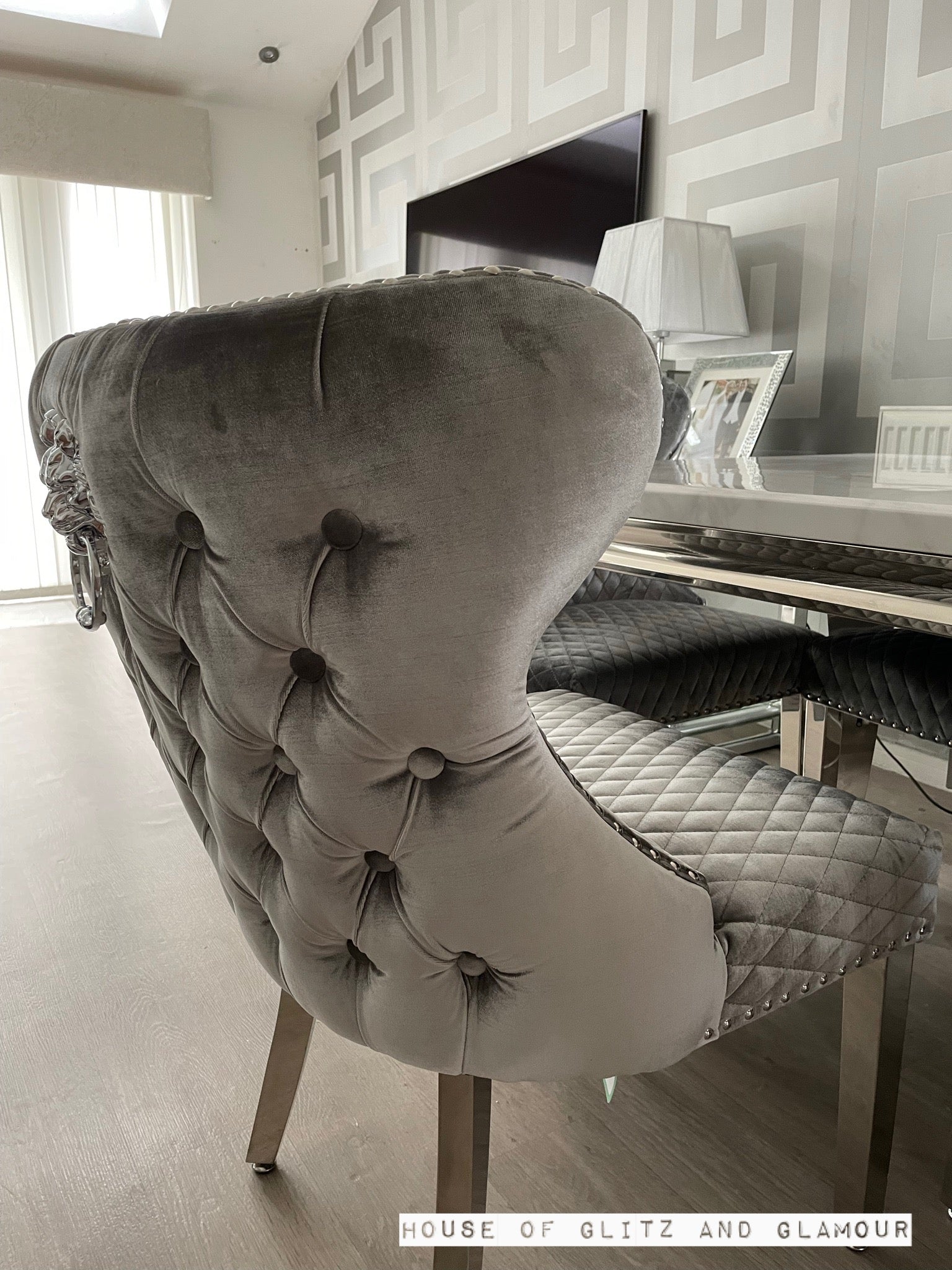 Valentino Brushed Silver Velvet Lion Knocker Dining Chair.
